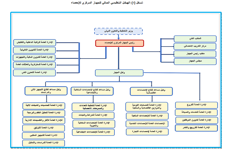 Central Statistical Organization operates in accordance with the Organizational structure approved by CSO regulations issued in 2003 and as it is shown in the figure on a temporary basis , with some necessary innovations that will be contained in the new organizational structure imposed by regional , Arab and International updates in functional directives and statistical work .